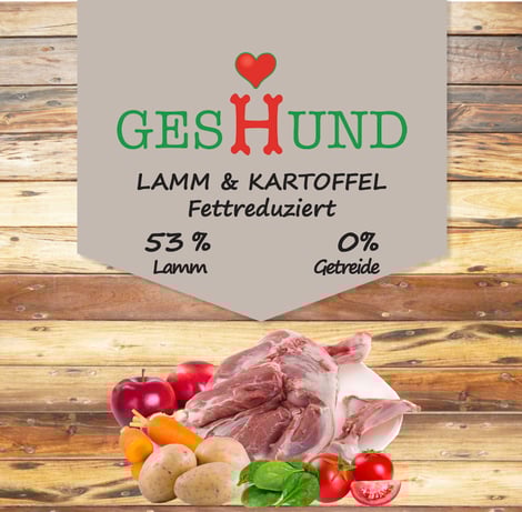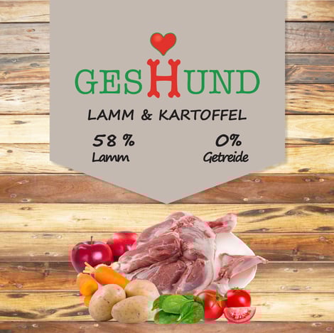 Frisches Lammfleisch 42,5 %, Kartoffeln 24 %, Lammprotein (dehydriert) 13 %, Erbsen, Hühnerfett, Lammleber (hydrolysiert) 3,2 %, Erbsenprotein, Leinsamen, Hefe, Mineralstoffe, Apfel getr., Cranberry getr., Karotten getr., Tomaten getr., Spinat getr., Yucca schidigera