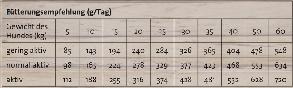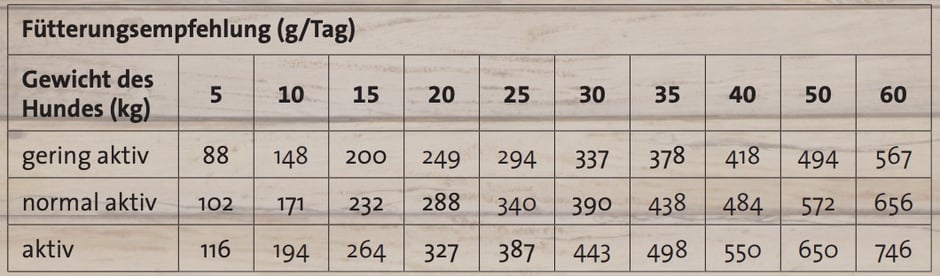 Rohprotein 20,0 %, Rohfett 10,0 %, Rohfaser 2,5 %, Rohasche 7,0 %, Calcium 1,35 %, Phosphor 1,0 %